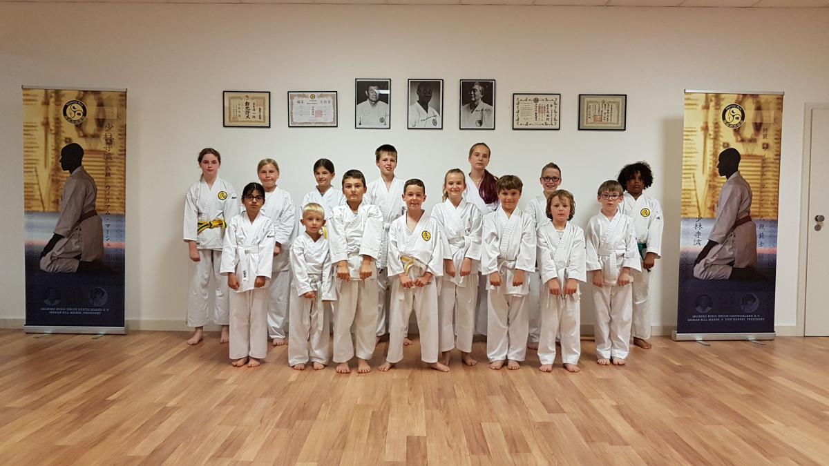 Im Dojo wurden die insgesamt 28 Kinder im Alter von 7 bis 12 Jahren von den drei Prüfern begrüßt und entsprechend der Gürtelfarben in Gruppen aufgeteilt: Weißgurte, Weiß-Gelb-Gurte, Gelb- und Gelb-Grün-Gurte. Abwechselnd zeigten alle Gruppen die für den nächsthöheren Gürtelgrad erforderlichen Grundtechniken (Kihons), Partnertechniken und Katas. Gut vorbereitet und hochkonzentriert gaben alle Kinder ihr Bestes und zeigten, was sie in den letzten Monaten gelernt hatten. Während sich die Prüfer über jedes der Kinder austauschten und beratschlagten, mussten sie in den Umkleideräumen warten und ihre Geduld wurde auf eine harte Probe gestellt. Bei der großen Anzahl an zu prüfenden Kindern dauerte es eine Weile, bis die Prüfungskommission mit der Auswertung fertig war. Nach ein paar unendlich scheinenden Minuten des Wartens war kurz vor 20 Uhr der Moment, auf den die Kinder so lange so ausdauernd, diszipliniert und mit viel Freude hintrainiert hatten, gekommen: der Sensei verkündete die Ergebnisse. Fast alle Kinder hatten die Prüfung zum nächsten Farbgurt bestanden. Der Sensei lobte den Einsatz der Kinder, ihre Motivation, ihre Fortschritte. Jedes Kind durfte einzeln vor die Prüfer treten, wurde beglückwünscht und bekam seine Urkunde überreicht. Die neuen Gürtel erhalten die Kinder in der nächsten Trainingsstunde. Eine besondere Überraschung gab es bei den Schwestern Ilena und Lenia Köhler. Als sie vor dem Sensei standen, erfuhren sie, dass die Prüfungskommission aufgrund ihrer hervorragenden Leistungen sowohl im Training als auch in der Prüfung entschieden hatte, dass beide eine Gürtelfarbe überspringen und ab sofort statt den gelb-grünen den grünen Gürtel tragen durften. Die beiden konnten ihr Glück kaum fassen und strahlten gemeinsam mit den anderen Kindern vor Freude um die Wette. Kurz nach 20 Uhr verließen die Kinder erleichtert, stolz und überglücklich das Dojo und wurden von ihren wartenden Eltern, Freunden und Geschwistern in Empfang genommen.