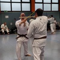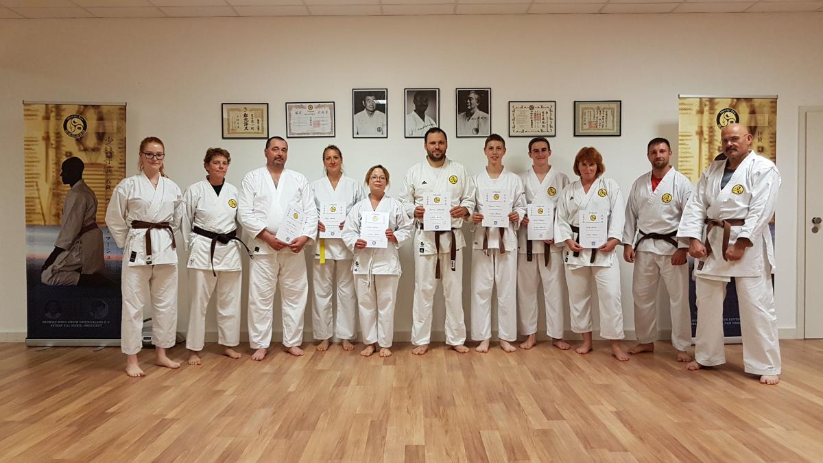 Nach dem Lehrgang fanden die Kyu und Dan Prüfungen statt. Gezeigt werden musste Kihon aus den Katas, dann Kata und Bunkai und im Anschluss noch Kobudo.