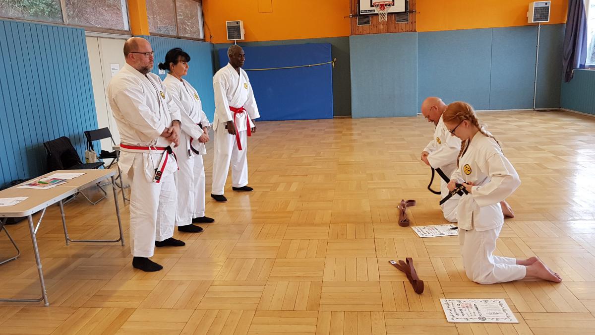 Pünktlich um 18 Uhr starteten die Prüfungen, die diesmal in Etappen stattfanden. Besonders war auch, dass die Gürtelfarben dem Deutschen Karateverband (DKV), dem der Verein im letzten Jahr beigetreten war, angepasst wurden und damit der gelb-grüne Gürtel durch einen orangenen ersetzt und als neuen Gürtelgrad der lilafarbene nach dem blauen eingeführt wurde.