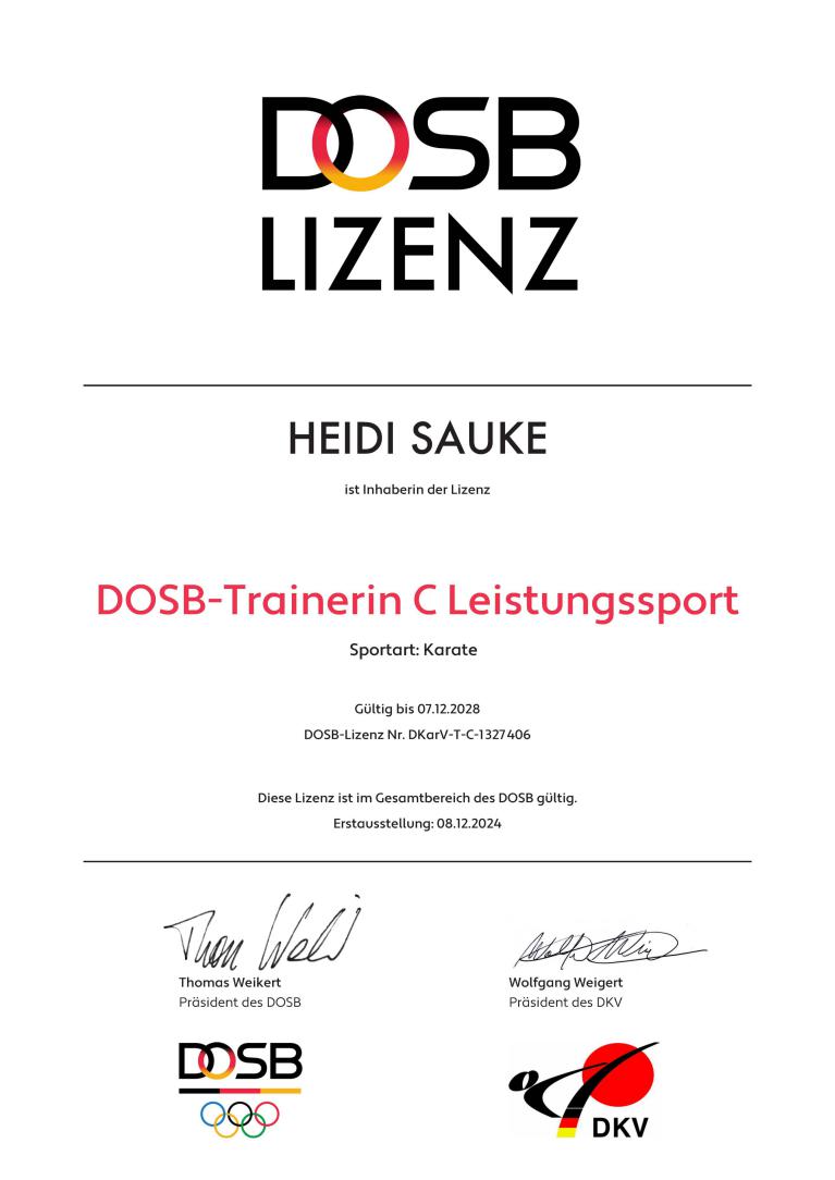 Nach mehreren Trainingseinheiten und Wochenenden beim Deutschen Sportbund und beim Deutschen Karate Verband besteht Heidi die Prüfung zur Karate C Trainerin. Herzlichen Glückwunsch. Das ist eine tolle Bereicherung für unseren Verein.