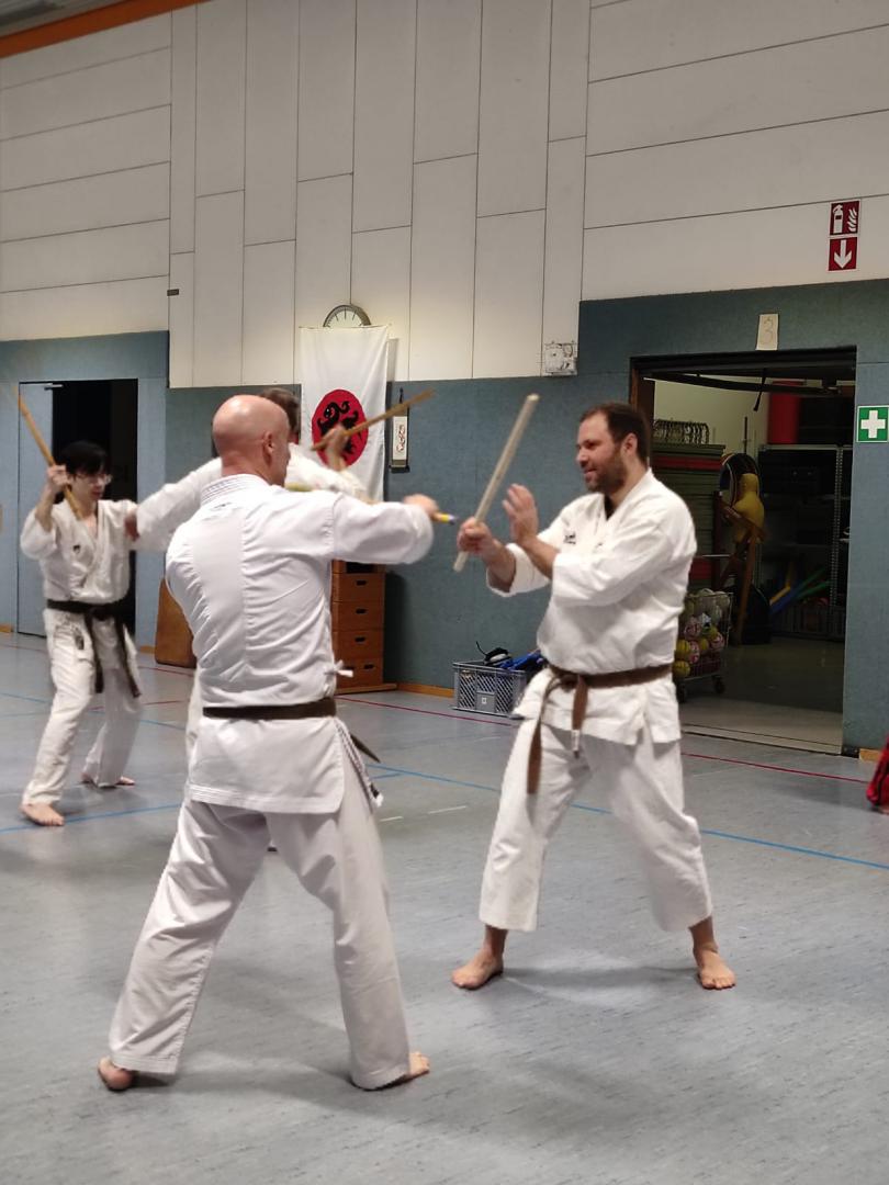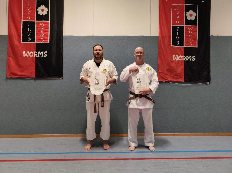 Am 23. November fuhren Martin Schramm und Andreas Frick nach Worms um sich der Prüfungskommision des DKV ( Sensei Marcus Gutzmer 7. Dan und Sensei Christoff Offen 6. Dan) zu stellen. Voran gab es einen Stick Fighting Lehrgang mit Bunkai Techniken aus Kata um einen Stockangriff abzuwehren. Dann zur Dan Prüfung mussten die Prüflingen das Kihon Programm der jeweiligen Prüfungskata laufen. Der 2. Teil umfasste den Kata Vortrag von Patsai Dai und Kushanku Dai. Dann wurde auch schon Bunkai der Kata Patsai Dai verlangt welche beide super meisterten. Als Wahlprogramm stand noch Kobudo auf dem Zettel. Matsuhiga no kon, Sushi no kon Dai, Noburo Tambo no Kata und Sekiun no Tambo wurden vorgetragen. Nach dem abschliessenden Kumite konnten beide ihre 1. Dan Urkunden entgegennehmen. Wir sind sehr stolz auf unsere frisch gebackenen Schwarzgurte und wünschen ihnen viel Erfolg für die künftige Laufbahn.